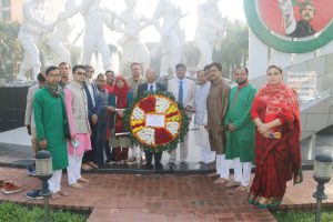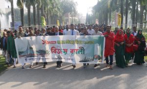 বিপুল উৎসাহ ও উদ্দীপনার মধ্য দিয়ে বঙ্গবন্ধু শেখ মুজিবুর রহমান কৃষি বিশ্ববিদ্যালয়ে আজ ১৬ ডিসেম্বর’২৩ ৫৩ তম বিজয় দিবস উদযাপিত হলো। দিবসের কর্মসূচির মধ্যে সকালে ৯:৩০ টায় বিজয় র্যালী, বঙ্গবন্ধুর প্রতিকৃতি ও জয়বাংলা ভাস্কর্যে পুষ্পস্তবক অর্পন, আলোকচিত্র প্রদর্শনী, শিশু-কিশোরদের অংশগ্রহণে চিত্রাঙ্কন প্রতিযোগিতা, ছাত্র-ছাত্রী, শিক্ষক, কর্মকর্তা ও কর্মচারীদের অংশগ্রহণে বিভিন্ন প্রীতি খেলাধূলা, পুরস্কার বিতরণ এবং বিশ্ববিদ্যালয় কেন্দ্রীয় মসজিদে বাদ যোহর বিশেষ দোয়া অনুষ্ঠিত হয়।