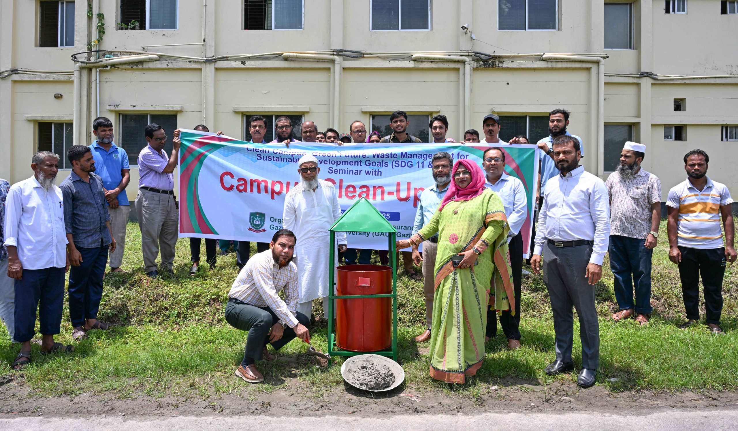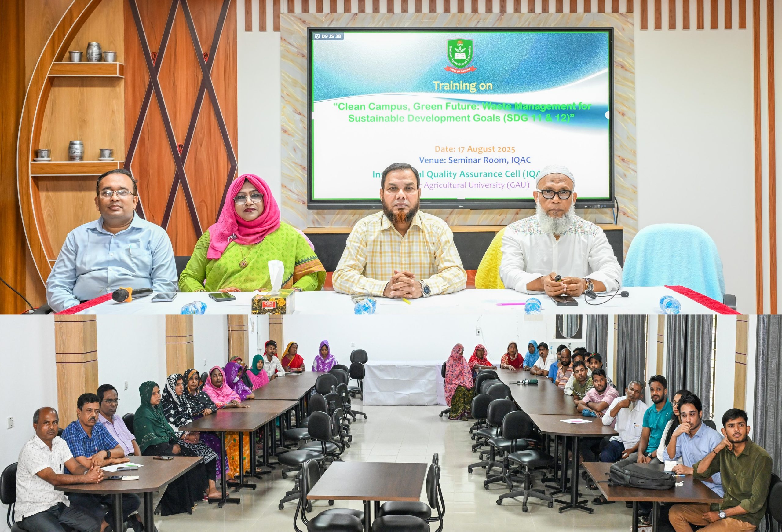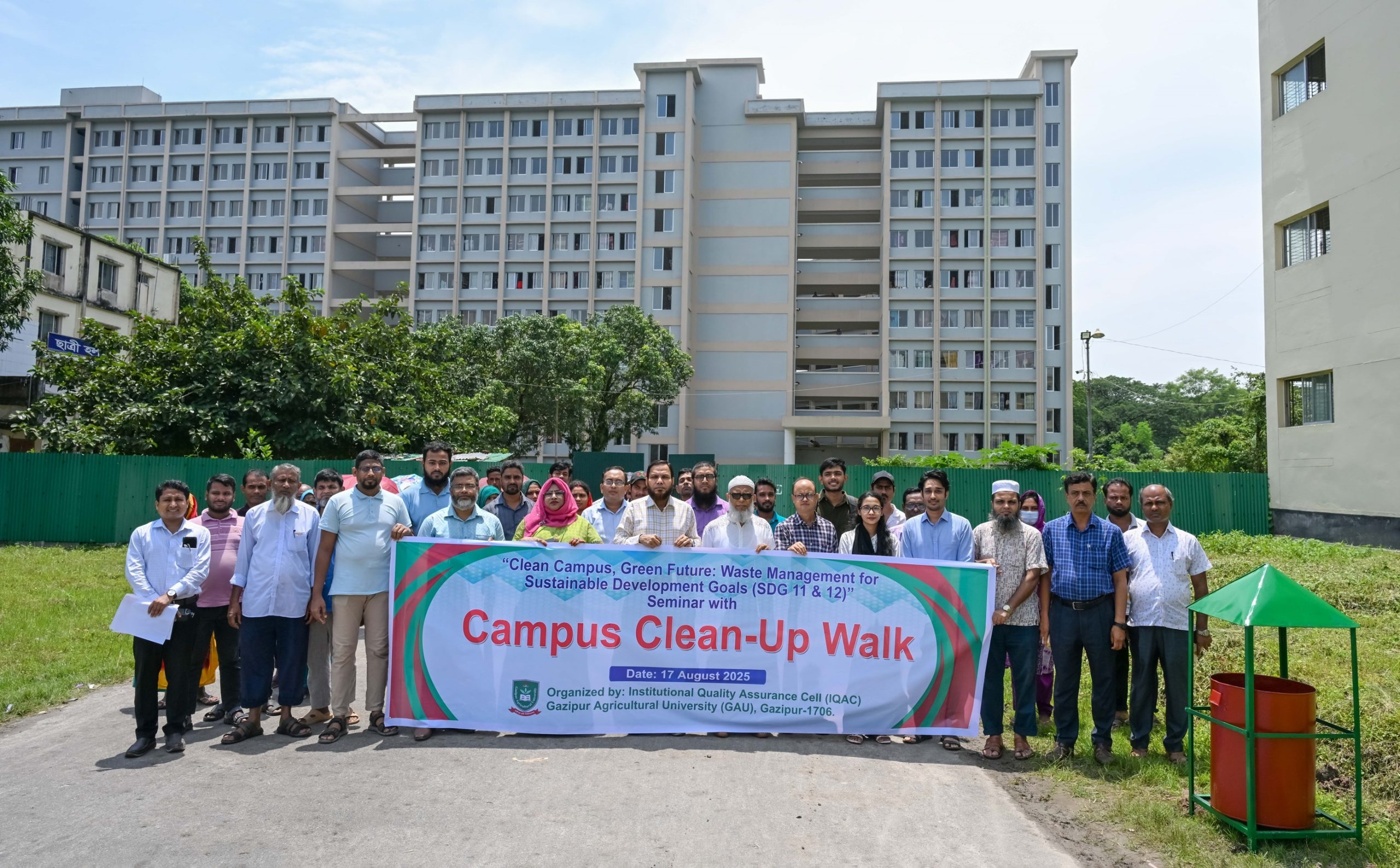 পরিবেশবান্ধব উন্নয়ন ও পরিচ্ছন্ন ক্যাম্পাস গঠনের লক্ষ্যে গাজীপুর কৃষি বিশ্ববিদ্যালয়ে (গাকৃবি) অনুষ্ঠিত হলো এক বিশেষ প্রশিক্ষণ কর্মসূচি “পরিচ্ছন্ন ক্যাম্পাস, সবুজ ভবিষ্যৎ: টেকসই উন্নয়নে বর্জ্য ব্যবস্থাপনা” শীর্ষক অনুষ্ঠান। বিশ্ববিদ্যালয়ের ইনস্টিটিউশনাল কোয়ালিটি অ্যাসিওরেন্স সেল (আইকিউএসি) কর্তৃক আয়োজিত এ টেকসই উন্নয়নমূলক প্রশিক্ষণটি আজ রবিবার (১৭ আগস্ট) সকাল ১১ টায় আইকিউএসির সেমিনার রুমে অনুষ্ঠিত হয়। গাকৃবিতে টেকসই বর্জ্য ব্যবস্থাপনা সংস্কৃতি গড়ে তোলার প্রয়াসে নতুন ডাস্টবিন স্থাপন, সচেতনতা বৃদ্ধি এবং শিক্ষক-শিক্ষার্থী ও কর্মকর্তা-কর্মচারীগণের সক্রিয় অংশগ্রহণের মাধ্যমে ‘ক্যাম্পাস গ্রিন লিডার’ হিসেবে সম্পৃক্ত করার উদ্দেশ্যে এ প্রশিক্ষণ অনুষ্ঠিত হয়েছে। অনুষ্ঠানে সভাপতিত্ব করেন আইকিউএসি’র পরিচালক প্রফেসর ড. নাসরীন আক্তার আইভী। আইকিউএসি’র অতিরিক্ত পরিচালক প্রফেসর ড. মোহাম্মদ শরীফ রায়হান এর সঞ্চালনায় অনুষ্ঠানে প্রধান অতিথি হিসেবে উপস্থিত ছিলেন গাজীপুর কৃষি বিশ্ববিদ্যালয়ের উপাচার্য প্রফেসর ড. জিকেএম মোস্তাফিজুর রহমান। অনুষ্ঠানে বিশেষ অতিথি ছিলেন ট্রেজারার প্রফেসর ড. মোঃ সফিউল ইসলাম আফ্রাদ। এ বিশেষ অনুষ্ঠানে প্রশিক্ষার্থী হিসেবে উপস্থিত ছিলেন গাকৃবির শিক্ষক-শিক্ষার্থী, কর্মকর্তা ও পরিচ্ছন্নতাকর্মীগণসহ ৫০ জন সদস্য। অনুষ্ঠানের শুরু হয় আইকিউএসি’র সভাপতির স্বাগত বক্তব্য প্রদানের মধ্য দিয়ে। বক্তব্যে তিনি টেকসই উন্নয়ন লক্ষ্যমাত্রার অভীষ্ট অর্জন ও এ প্রশিক্ষণের বিষয়ে সারসংক্ষেপ তুলে ধরেন। এরপর বৈশ্বিক টেকসই উন্নয়ন র্যাঙ্কিংয়ে এগিয়ে যাওয়ার সুনির্দিষ্ট পথ হিসেবে বিশ্ববিদ্যালয়ে বর্জ্য ব্যবস্থাপনার ভ‚মিকা ও পরিচ্ছন্নতা কার্যক্রম কেমন হওয়া উচিত সে বিষয়ে সচিত্র তথ্য উপস্থাপন করেন ট্রেজারার প্রফেসর ড. মোঃ সফিউল ইসলাম আফ্রাদ। পরে প্রধান অতিথির বক্তব্যে উপাচার্য বলেন, ‘‘আজকের এই প্রশিক্ষণ শুধু একটি কর্মসূচি নয়, বরং এটি একটি সচেতনতা জাগ্রতকরণের উদ্যোগ। বর্জ্য ব্যবস্থাপনা এখন আর শুধু পরিচ্ছন্নতার বিষয় নয় এটি স্বাস্থ্য, পরিবেশ, অর্থনীতি এবং টেকসই উন্নয়ন লক্ষ্যমাত্রা (এসডিজি) অর্জনের সঙ্গে ওতপ্রোতভাবে জড়িত। গাজীপুর কৃষি বিশ্ববিদ্যালয় এই উপলব্ধি থেকেই পরিবেশ বিষয়ক শিক্ষাকে শুধু পাঠ্যসূচির মধ্যেই সীমাবদ্ধ রাখছে না, বরং বাস্তব জীবনে প্রয়োগ উপযোগী করে তুলছে।’’ বক্তব্যের এক পর্যায়ে উপাচার্য উপস্থিত সকলকে ক্যাম্পাস পরিচ্ছন্ন রাখার বিষয়ে প্রতিজ্ঞাবদ্ধ হবার প্রতিশ্রæতি নেন। উপাচার্যের বক্তব্যের পর তাঁর নেতৃত্বে ক্যাম্পাস পরিচ্ছন্ন ও পরিবেশ সচেতনতা বৃদ্ধির উদ্দেশ্যে বিশ্বব