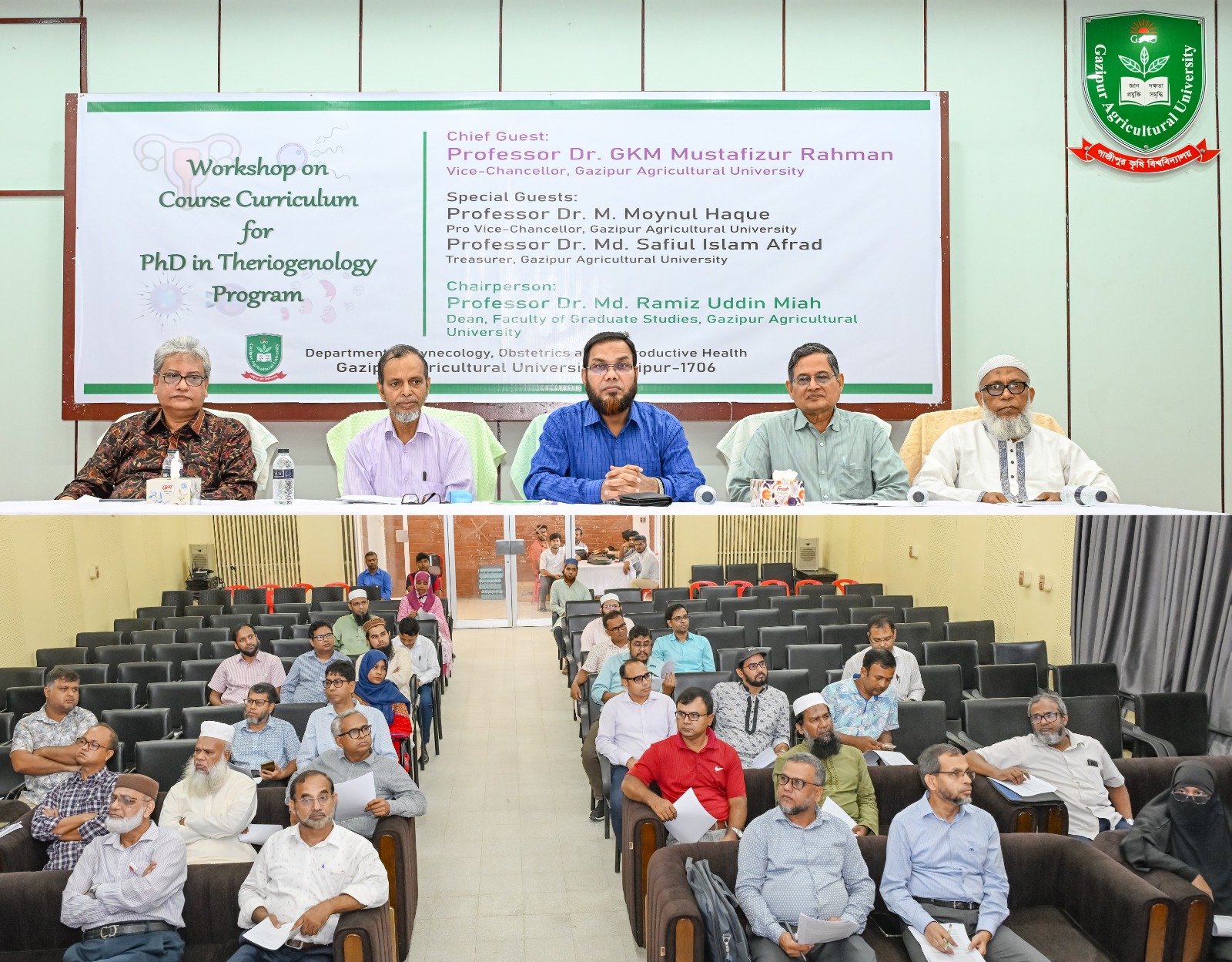 গাজীপুর কৃষি বিশ্ববিদ্যালয় (গাকৃবি) এর গাইনিকোলজি, অবস্টেট্রিকস এন্ড রিপ্রোডাক্টিভ হেলথ বিভাগে ‘থেরিওজেনোলজি’ এর উপর পিএইচডি ডিগ্রি প্রদানের লক্ষ্যে প্রোগ্রাম চালুকরণ বিষয়ে কর্মশালা অনুষ্ঠিত হয়েছে। গবাদিপশুর প্রজনন দক্ষতা বৃদ্ধির মাধ্যমে দুধ, মাংস ও প্রাণীজাত পণ্যের উৎপাদন বাড়িয়ে থেরিওজেনোলজি প্রাণীর প্রজনন ও সংশ্লিষ্ট রোগ বিষয়ে বিজ্ঞানভিত্তিক জ্ঞান প্রদান করে প্রাণিসম্পদ খাতে দক্ষ গবেষক তৈরি, আধুনিক প্রজনন ব্যবস্থাপনা এবং উন্নত গবেষণা কার্যক্রম বাস্তবায়নই এ পিএইচডি চালু করণের মূল উদ্দেশ্য। বিশ্ববিদ্যালয়ের গাইনিকোলজি, অবস্টেট্রিকস এন্ড রিপ্রোডাক্টিভ হেলথ বিভাগের আয়োজনে অনুষ্ঠিত এ কর্মশালাটি আজ ১৪ আগস্ট (বৃহস্পতিবার) বিশ্ববিদ্যালয়ের পুরাতন অডিটোরিয়ামে সকাল ১১টায় অনুষ্ঠিত হয়। অনুষ্ঠানে প্রধান অতিথি হিসেবে উপস্থিত ছিলেন গাজীপুর কৃষি বিশ্ববিদ্যালয়ের উপাচার্য প্রফেসর ড. জিকেএম মোস্তাফিজুর রহমান। গ্র্যাজুয়েট স্টাডিজ অনুষদের ডিন প্রফেসর ড. মোঃ রমিজ উদ্দীন মিয়ার সভাপতিত্বে অনুষ্ঠানে বিশেষ অতিথি ছিলেন প্রো-উপাচার্য প্রফেসর ড. এম. ময়নুল হক এবং ট্রেজারার প্রফেসর ড. মোঃ সফিউল ইসলাম আফ্রাদ। এছাড়াও কর্মশালায় উপস্থিত ছিলেন গাজীপুর কৃষি বিশ্ববিদ্যালয়ের ভেটেরিনারি মেডিসিন এন্ড অ্যানিম্যাল সায়েন্স অনুষদের ডিন, বিভিন্ন পরিচালক, বিভাগের শিক্ষক-শিক্ষার্থীসহ বাংলাদেশ কৃষি বিশ্ববিদ্যালয় (বাকৃবি) এবং চট্টগ্রাম ভেটেরিনারি মেডিসিন এন্ড অ্যানিম্যাল সায়েন্সেস বিশ্ববিদ্যালয় (সিভাসু) থেকে আগত বিশেষজ্ঞবৃন্দ। অনুষ্ঠানের শুরুতে ডিগ্রিটির কোর্স লে-আউট পর্বে পিএইচডি ইন থেরিওজেনোলজি বিষয়ে তথ্যবহুল প্রেজেন্টেশন দেন গাইনিকোলজি, অবস্টেট্রিকস এন্ড রিপ্রোডাক্টিভ বিভাগের প্রধান প্রফেসর ড. আ ন ম আমিনুর রহমান। উপস্থাপনায় তিনি ডিগ্রিটির প্রয়োজনীয়তা, গুরুত্ব এবং সুবিধাবলির প্রসঙ্গ উল্লেখপূর্বক কোর্স সংক্রান্ত বিস্তারিত তথ্য তুলে ধরেন। পরে কোর্সটিকে কীভাবে সুচারুরূপে পরিচালনা করা যায় সে লক্ষ্যে ফ্লোর উন্মুক্ত করে উপস্থিত বিশেষজ্ঞবৃন্দের দৃষ্টি আকর্ষণ করা হয়। উন্মুক্ত এ প্রশ্নোত্তর পর্বে বিশেষজ্ঞগণ নতুন কোর্স কাঠামো, পাঠ্যসূচি, একাডেমিক ও গবেষণার মান উন্নয়নসহ বিভিন্ন মতামত ও পরামর্শ প্রদান করেন। পরে প্রধান অতিথির বক্তব্যে উপাচার্য বলেন, গাইনিকোলজি অবস্টেট্রিকস এন্ড রিপ্রোডাক্টিভ বিভাগের উদ্যোগে ‘থেরিওজেনোলজি’ এর উপর পিএইচডি চালু করার বিষয়টি নিঃসন্দেহে সময়োপযোগী এবং প্রশংসনীয়। বর্তমান বিশ্বে প্রাণিসম্পদ খাত কেবল খাদ্য নিরাপত্তা নয়, বরং অর্থনৈতিক প্রবৃদ্ধি, কর্মসংস্থান ও গ্রামীণ উন্নয