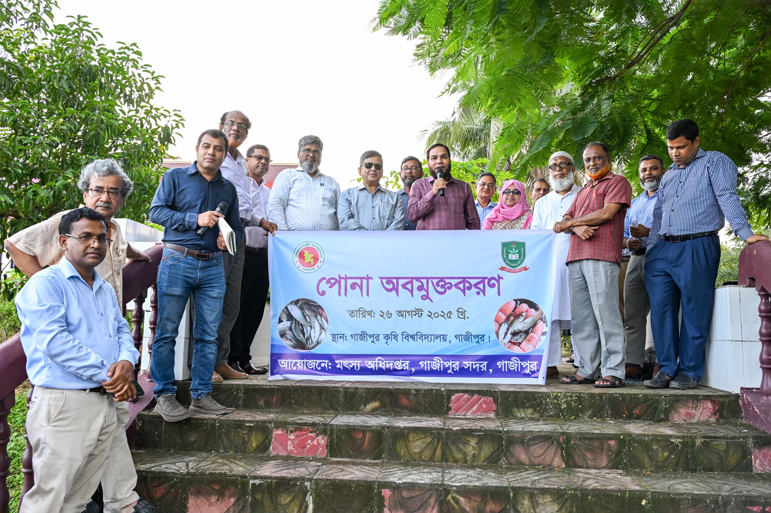 মৎস্য সম্পদের টেকসই উন্নয়ন ও পরিবেশবান্ধব মাছ চাষ স¤প্রসারণের লক্ষ্যে গাজীপুর কৃষি বিশ্ববিদ্যালয়ে (গাকৃবি) মৎস্য পোনা অবমুক্তকরণ অনুষ্ঠানের আয়োজন করা হয়েছে। মৎস্য অধিদপ্তর, গাজীপুর এর আয়োজনে এবং গাকৃবির ফিশারিজ অনুষদের সার্বিক সহযোগিতায় এ অনুষ্ঠানটি গতকাল ২৬ আগস্ট (মঙ্গলবার) বিকেলে বিশ্ববিদ্যালয়ের আবাসিক এলাকার নির্ধারিত পুকুরে মৎস্য পোনা অবমুক্তকরণের মাধ্যমে উদ্বোধন করা হয়। এরপর সেখানে একটি সংক্ষিপ্ত আলোচনাসভা অনুষ্ঠিত হয়। এতে সভাপতিত্ব করেন মাৎস্যবিজ্ঞান অনুষদের ডিন প্রফেসর ড. মুর্শিদা খান। অনুষ্ঠানে প্রধান অতিথি হিসেবে উপস্থিত ছিলেন গাজীপুর কৃষি বিশ্ববিদ্যালয়ের ভাইস-চ্যান্সেলর প্রফেসর ড. জিকেএম মোস্তাফিজুর রহমান। বিশেষ অতিথি হিসেবে গাকৃবির উপ-উপাচার্য প্রফেসর ড. এম. ময়নুল হক, ট্রেজারার প্রফেসর ড. মোঃ সফিউল ইসলাম আফ্রাদ এবং মৎস্য অধিদপ্তরের ঢাকা বিভাগীয় পরিচালক মোঃ মনিরুল ইসলাম উপস্থিত ছিলেন। এছাড়াও গাজীপুর জেলা মৎস্য অধিদপ্তরের কর্মকর্তা-কর্মচারীবৃন্দসহ গাকৃবির ফিশারিজ অনুষদের শিক্ষকবৃন্দ, রেজিস্ট্রার মোঃ আবদুল্লাহ্ মৃধা, প্রক্টর প্রফেসর ড. মোহাম্মদ সাইফুল আলম, বিভিন্ন অনুষদীয় ডিন, পরিচালক, শিক্ষক এবং কর্মকর্তা-কর্মচারীবৃন্দ উপস্থিত ছিলেন। আলোচনায় স্বাগত বক্তব্য প্রদান করেন বিশ্ববিদ্যালয়ের রেজিস্ট্রার। পরে ধারাবাহিকভাবে মৎস্যসম্পদের গুরুত্বের উপর বক্তব্য প্রদান করেন অতিথিবৃন্দ। বক্তব্যে তাঁরা দেশের ক্রমবর্ধমান চাহিদা অনুযায়ী মাছ উৎপাদনে গবেষণাভিত্তিক পরিকল্পনা, দক্ষ মানবসম্পদ গঠনের প্রয়োজনীয়তা এবং শিক্ষাপ্রতিষ্ঠান ও সরকারি সংস্থার সমন্বয়ের গুরুত্ব তুলে ধরেন। এ সময় মৎস্য অধিদপ্তরের ঢাকা বিভাগীয় পরিচালক তাঁর বক্তব্যে বলেন, “বিশ্ববিদ্যালয়ের মতো গবেষণা ও শিক্ষাকেন্দ্রের সঙ্গে সমন্বিতভাবে কাজ করার মাধ্যমে মাছের উৎপাদন যেমন বাড়বে, তেমনি দেশের খাদ্যনিরাপত্তা নিশ্চিত করা সহজ হবে।” অন্যদিকে প্রধান অতিথির বক্তব্যে উপাচার্য বলেন, “এই ধরনের উদ্যোগ আমাদের দেশের মৎস্যখাতের অগ্রগতিকে ত্বরান্বিত করবে। বিশ্ববিদ্যালয় এবং মৎস্য অধিদপ্তরের যৌথ উদ্যোগে আমরা একটি টেকসই ও আধুনিক মৎস্য ব্যবস্থাপনার দিকে এগিয়ে যেতে পারি।” এ সময় উপাচার্য মৎস্য অধিদপ্তরকে গাকৃবির ফিশারিজ অনুষদের শিক্ষার্থীদের ইন্টার্নশিপ করার সুযোগ দেয়ার আহবান জানান। সভাপতির সমাপনী বক্তব্যের মধ্যদিয়ে অনুষ্ঠানের সমাপ্তি ঘটে।