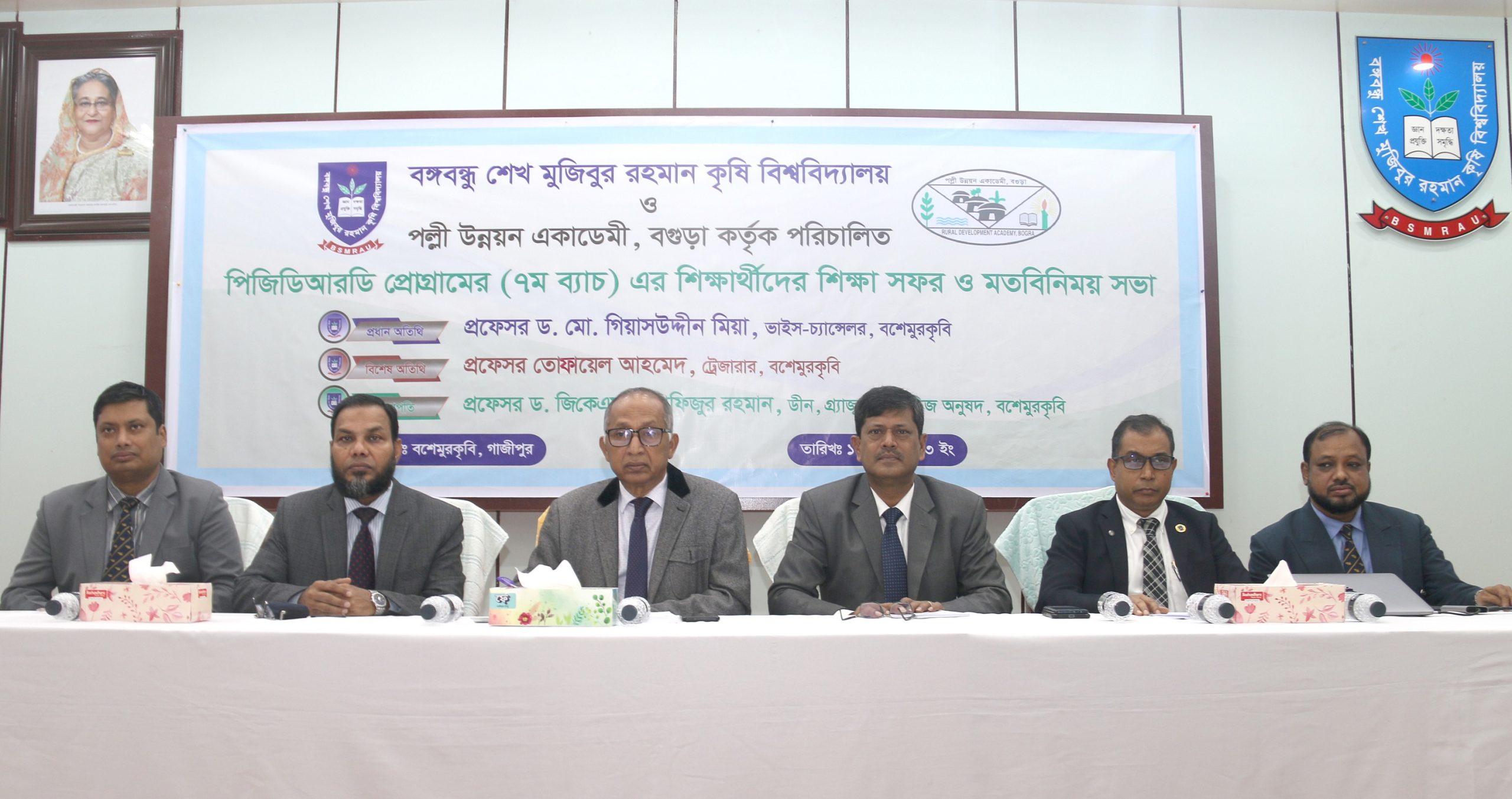 বঙ্গবন্ধু শেখ মুজিবুর রহমান কৃষি বিশ্ববিদ্যালয় ও পল্লী উন্নয়ন একাডেমী, বগুড়া এর যৌথ উদ্যোগে পরিচালিত পিজিডিআরডি প্রোগ্রামের ৭ম ব্যাচের শিক্ষার্থীদের শিক্ষা সফর ও মতবিনিময় সভা আজ ১৩ ডিসেম্বর ২০২৩, বুধবার সকাল ১০:৩০ ঘটিকায় বঙ্গবন্ধু শেখ মুজিবুর রহমান কৃষি বিশ্ববিদ্যালয়ের অডিটরিয়ামে অনুষ্ঠিত হয়।