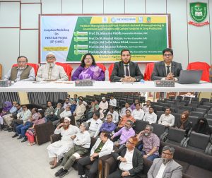 অনুষ্ঠানে প্রধান অতিথি হিসেবে উপস্থিত ছিলেন বাংলাদেশ বিশ্ববিদ্যালয় মঞ্জুরী কমিশনের সদস্য প্রফেসর ড. মাসুমা হাবিব। বিশেষ অতিথি হিসেবে উপস্থিত ছিলেন বিশ্ববিদ্যালয়ের প্রো-ভিসি প্রফেসর ড. এম. ময়নুল হক এবং ট্রেজারার প্রফেসর ড. মোঃ সফিউল ইসলাম আফ্রাদ। বাংলাদেশ ধান গবেষণা ইনস্টিটিউটের পরিচালক (গবেষণা) ড. মোঃ রফিকুল ইসলাম এবং বাংলাদেশ কৃষি বিশ্ববিদ্যালয়ের প্রফেসর ড. মফিজুর রহমান জাহাঙ্গীর কর্মশালায় বিশেষজ্ঞ হিসেবে উপস্থিত ছিলেন। এছাড়াও অনুষ্ঠানে বিশ্ববিদ্যালয়ের বিভিন্ন অনুষদীয় ডিন, পরিচালক, প্রক্টর প্রফেসর ড. মোহাম্মদ সাইফুল আলম, শিক্ষক, গবেষক ও শিক্ষার্থীরা উপস্থিত ছিলেন। অনুষ্ঠানের শুরুতে প্রকল্পের উপ-ব্যবস্থাপক প্রফেসর ড. মোঃ মিজানুর রহমান মূল প্রবন্ধ উপস্থাপন করেন। উপস্থাপনায় তিনি কৃষির চলমান চ্যালেঞ্জ ও সম্ভাবনার কথা তুলে ধরে স্বল্প ব্যয়ে আধুনিক প্রযুক্তিগুলো গ্রহণ করলে কীভাবে দেশের কৃষি উৎপাদন আরও নিরাপদ, টেকসই ও জলবায়ুসহনশীল হতে পারে সেসব বিষয়ে বিস্তারিত আলোচনা করেন। প্রবন্ধ উপস্থাপনা শেষে ভাইস-চ্যান্সেলরের নেতৃত্বে এবং কর্মশালায় অংশগ্রহণকারী শিক্ষক, গবেষক ও শিক্ষার্থীদের সঙ্গে একটি উন্মুক্ত প্রশ্নোত্তর পর্বও অনুষ্ঠিত হয়, যেখানে প্রাণবন্ত আলোচনার মাধ্যমে ফলপ্রসূ মন্তব্য উঠে আসে। এ সময় প্রধান অতিথির বক্তব্যে ড. মাসুমা হাবিব এ প্রজেক্টের মাধ্যমে লব্ধ গবেষণা যেন কৃষি বিপ্লবের জন্য উদাহরণ হয়ে থাকে সেদিকে লক্ষ রাখার আহŸান জানান। পরে সভাপতির সমাপনী বক্তব্যে উপাচার্য প্রফেসর ড. জিকেএম মোস্তাফিজুর রহমান বলেন, “খাদ্য নিরাপত্তায় সারের সঠিক ব্যবহার নিশ্চিতকরণ ও ফসলে প্রোবায়োটিক প্রযুক্তির ব্যবহার বর্তমানে অতীব জরুরি হয়ে পড়েছে। এ প্রজেক্টের মাধ্যমে কৃষিক্ষেত্রে অভাবনীয় সফলতা পাওয়া সম্ভব যা দেশের কৃষির জন্য এক মাইলফলক অর্জন হবে।”
