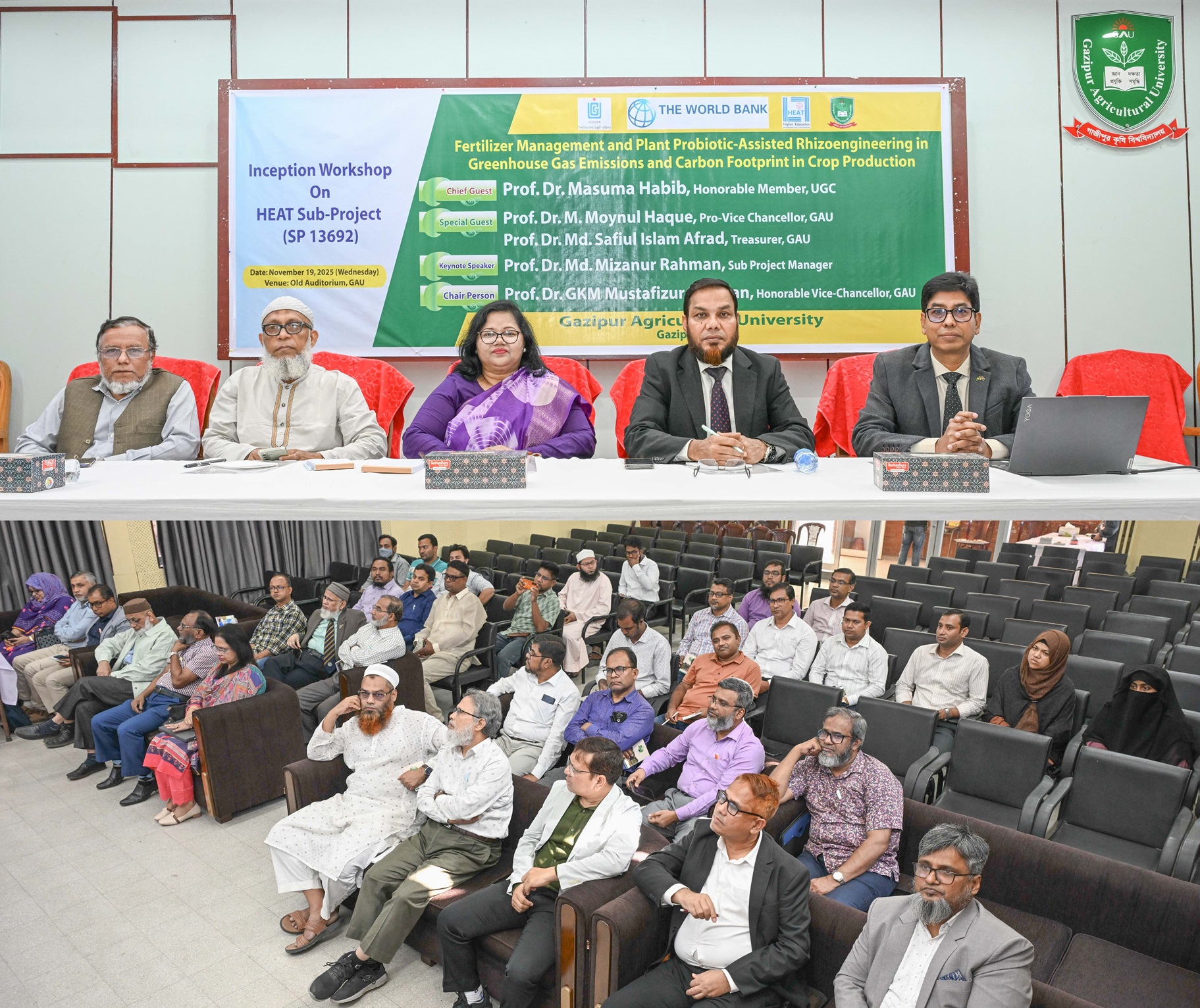 আগামীর কৃষিতে বৈজ্ঞানিক উপায়ে আধুনিক প্রযুক্তির সহায়তায় নিরাপদ ও অধিক ফসল উৎপাদনের লক্ষ্যে গাজীপুর কৃষি বিশ্ববিদ্যালয়ে “সারের স্মার্ট ব্যবস্থাপনা ও প্রোবায়োটিক প্রযুক্তি: ফসল উৎপাদনে গ্রিনহাউস গ্যাস কমিয়ে কার্বন ফুটপ্রিন্ট হ্রাসের নতুন দিগন্ত” শীর্ষক এক গুরুত্বপূর্ণ কর্মশালা অনুষ্ঠিত হয়েছে। হায়ার এডুকেশন এক্সিলারেশন অ্যান্ড ট্রান্সফরমেশন (হিট)” প্রকল্পের অর্থায়নে এবং প্রকল্পের উপ-ব্যবস্থাপক প্রফেসর ড. মোঃ মিজানুর রহমান এর সার্বিক তত্ত¡াবধানে কর্মশালাটি বিশ্ববিদ্যালয়ের পুরাতন অডিটোরিয়ামে ১৯ নভেম্বর (বুধবার) সকাল ১১টায় অনুষ্ঠিত হয়। এই কর্মশালার মূল লক্ষ্য হলো আধুনিক কৃষিকে আরও পরিবেশবান্ধব, টেকসই ও বৈজ্ঞানিক ভিত্তিতে এগিয়ে নেওয়া। সারের সঠিক ব্যবস্থাপনা এবং উদ্ভিদ-প্রোবায়োটিকভিত্তিক রাইজো-ইঞ্জিনিয়ারিং প্রযুক্তি কীভাবে ফসল উৎপাদনে গ্রিনহাউস গ্যাস কমাতে পারে এবং সামগ্রিক কার্বন ফুটপ্রিন্ট হ্রাস করতে পারে তা কৃষক, গবেষক ও নীতিনির্ধারকদের কাছে স্পষ্টভাবে তুলে ধরা। গুরুত্বপূর্ণ এ কর্মশালায় সভাপতিত্ব করেন গাজীপুর কৃষি বিশ্ববিদ্যালয়ের ভাইস-চ্যান্সেলর প্রফেসর ড. জিকেএম মোস্তাফিজুর রহমান।