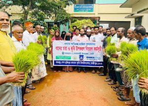 বন্যায় ক্ষতিগ্রস্ত ১০০ কৃষকের মাঝে ধানের চারাসহ কৃষি উপকরণ বিতরণ করল বশেমুরকৃবি