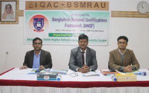 Latest News বাংলাদেশ ন্যাশনাল কোয়ালিফিকেশন্স ফ্রেমওয়ার্ক (বিএনকিউএফ) বিষয়ক কর্মশালা অনুষ্ঠিত বঙ্গবন্ধু শেখ মুজিবুর রহমান কৃষি বিশ্ববিদ্যালয়ে (বশেমুরকৃবি) দিনব্যাপী ‘বাংলাদেশ ন্যাশনাল কোয়ালিফিকেশন্স ফ্রেমওয়ার্ক (বিএনকিউএফ)’ কর্মশালা আজ (১২ ডিসেম্বর’২৩) মঙ্গলবার বিশ^বিদ্যালয় আইকিউএসি সেমিনার কক্ষে অনুষ্ঠিত হয়। কর্মশালায় বিশ্ববিদ্যালয়ের ট্রেজারার প্রফেসর তোফায়েল আহমেদ প্রধান অতিথি হিসেবে উপস্থিত ছিলেন। শুরুতে উদ্বোধনী বক্তব্যে প্রধান অতিথি বলেন, বিএনকিউএফ প্রনয়ন করা হয়েছে যাতে যোগ্যতার ফলাফলগুলি প্রাসঙ্গিক এবং জাতীয়ভাবে সামঞ্জস্যপূর্ণ থাকে, নমনীয় যোগ্যতার সংযোগ এবং জাতীয় ও আন্তর্জাতিক বহনযোগ্যতা এবং যোগ্যতার তুলনা করতে সহায়তা করে। বিএনকিউএফ রিপোর্ট একটি বিকশিত নথি যা সময়ে সময়ে পর্যালোচনা করা হয়ে থাকে। সভাপতির বক্তব্যে পরিচালক (আইকিউএসি) প্রফেসর ড. মোঃ মোতাহার হোসেন বলেন, বাংলাদেশ ন্যাশনাল কোয়ালিফিকেশন ফ্রেমওয়ার্ক (বিএনকিউএফ) হল একটি আন্তর্জাতিকভাবে বেঞ্চমার্ক জাতীয় উপকরণ যা দক্ষতা, জ্ঞান এবং মনোভাবের বিকাশ, শ্রেণীবিভাগ এবং স্বীকৃতির জন্য সম্মত স্তরের ধারাবাহিকতা। শিক্ষা ও প্রশিক্ষণ ব্যবস্থায় গুণগত পরিবর্তন আনার ক্ষেত্রে এটি একটি মৌলিক হাতিয়ার এবং এটি যোগ্যতার মধ্যে সম্পর্ক উনয়ন, বর্ণনা এবং পদ্ধতিগত করার জন্য কাঠামো প্রদান করে। এটি জাতীয় এবং আন্তর্জাতিকভাবে যোগ্যতার গুণগতমান, অ্যাক্সেস যোগ্যতা, সংযোগের পাশাপাশি জনসাধারণের এবং শ্রমবাজারের স্বীকৃতি উন্নত করার ভিত্তিকে মজবুত করে। অতিরিক্ত পরিচালক (আইকিউএসি) প্রফেসর ড. দীনেশ চন্দ্র সাহার সঞ্চালনায় কর্মশালায় বিশ্ববিদ্যালয়ের অনুষদীয় ডীনবৃন্দ ও বিভাগীয় প্রধানগণ অংশগ্রহণ করেন। Dec 13ictcellComments Disabled