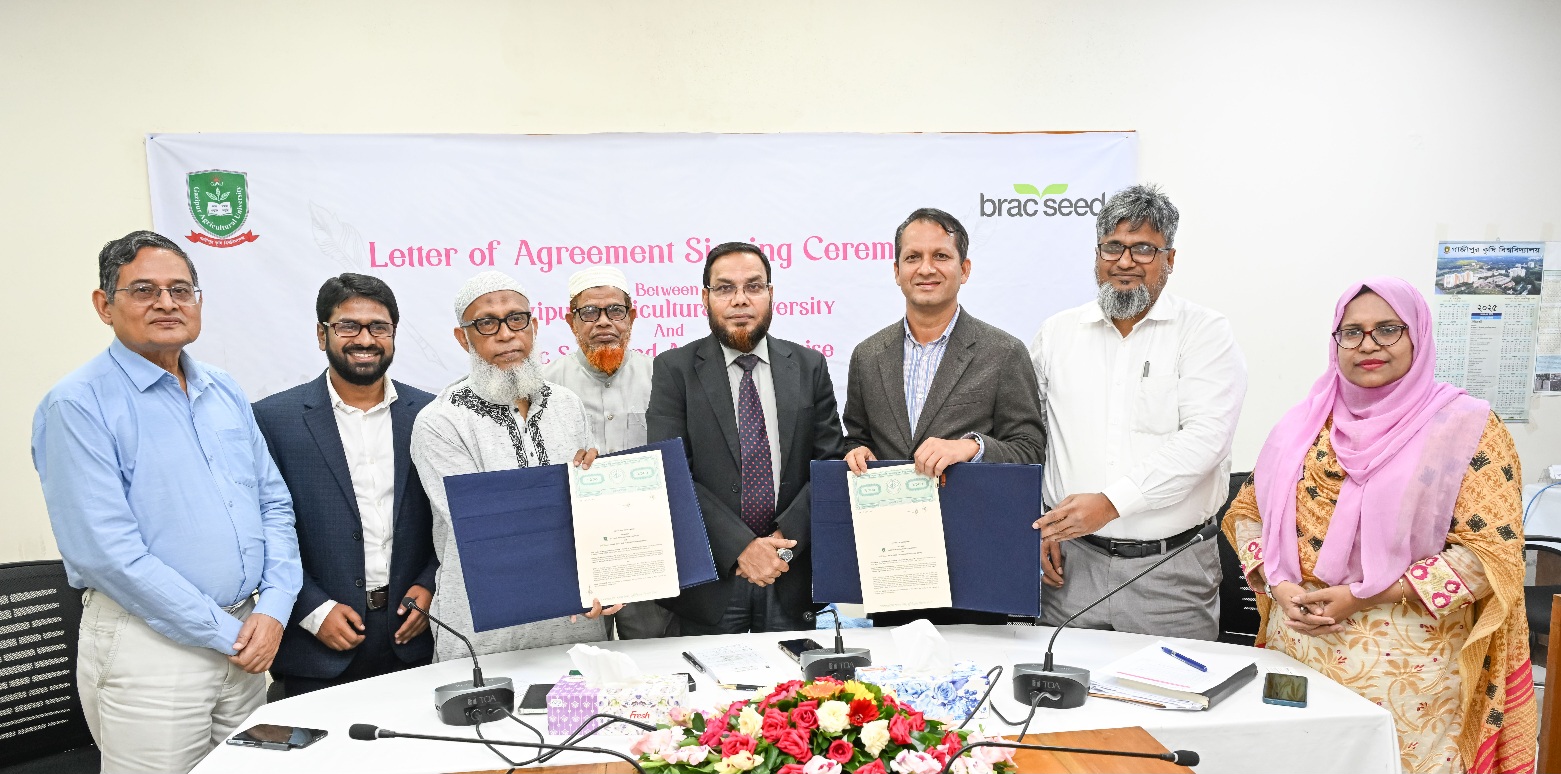পারস্পরিক সহযোগিতা জোরদারের লক্ষ্যে আজ, ৫ নভেম্বর (বুধবার), গাজীপুর কৃষি বিশ্ববিদ্যালয় (গাকৃবি) ও ব্র্যাক সিড অ্যান্ড অ্যাগ্রো এন্টারপ্রাইজের মধ্যে একটি গুরুত্বপূর্ণ সহযোগিতামূলক চুক্তিপত্র (লেটার অব অ্যাগ্রিমেন্ট) স্বাক্ষরিত হয়েছে। চুক্তির মূল উদ্দেশ্য হলো কৃষিক্ষেত্রে উদ্ভাবনী গবেষণা পরিচালনা, টেকসই কৃষি প্রযুক্তি ও পণ্যের ব্যবহার সম্প্রসারণ, শিল্প ও শিক্ষাঙ্গনের মধ্যে কার্যকর সমন্বয় গড়ে তোলা এবং উদ্ভাবিত জাত ও প্রযুক্তির মাঠ পর্যায়ে ব্যবহার নিশ্চিত করা। কৃষির সার্বিক উন্নয়ন ও সমৃদ্ধ ভবিষ্যৎ নির্মাণে নতুন দিগন্ত উন্মোচনকারী এ চুক্তি স্বাক্ষরিত হয় দুপুর আড়াই টায় গাজীপুর কৃষি বিশ্ববিদ্যালয়ের একাডেমিক কাউন্সিল সভাকক্ষে। এ চুক্তি স্বাক্ষর অনুষ্ঠানে সভাপতিত্ব করেন গাকৃবির ট্রেজারার প্রফেসর ড. মোঃ সফিউল ইসলাম আফ্রাদ। প্রধান অতিথি হিসেবে উপস্থিত ছিলেন গাকৃবির ভাইস-চ্যান্সেলর প্রফেসর ড. জিকেএম মোস্তাফিজুর রহমান। বিশেষ অতিথি হিসেবে উপস্থিত ছিলেন গাকৃবির প্রো-ভিসি প্রফেসর ড. এম. ময়নুল হক এবং ব্র্যাকের সিনিয়র পরিচালক, মোহাম্মদ আনিসুর রহমান। এ সময় আরো উপস্থিত ছিলেন ব্র্যাকের সহযোগী পরিচালক মোঃ আজিজুল হকসহ অন্যান্য কর্মকতাবৃন্দ এবং গাকৃবির বিভিন্ন অনুষদীয় ডিন, প্রক্টর প্রফেসর ড. মোহাম্মদ সাইফুল আলম, পরিচালক এবং সিনিয়র শিক্ষকবৃন্দ। গাকৃবির রেজিস্ট্রার মোঃ আবদুল্লাহ্ মৃধার সঞ্চালনায় অনুষ্ঠিত চুক্তি স্বাক্ষর অনুষ্ঠানের শুরু হয় প্রাণবন্ত এক পরিচিতি পর্বের মাধ্যমে। পরে ব্র্যাক সিড অ্যান্ড অ্যাগ্রো এন্টারপ্রাইজের পক্ষ থেকে ইতিহাস-ঐতিহ্য ও কর্মপরিধির উপর একটি প্রেজেন্টেশন দেন ব্র্যাকের সহকারী জেনারেল ম্যানেজার ড. মোঃ আরিফুল ইসলাম। গাকৃবির পক্ষ থেকে প্রদর্শন করা হয় একটি ডকুমেন্টারি যেখানে বিশ্ববিদ্যালয়ের ইতিহাস, উদ্ভাবন ও সাফল্যের বিবিধ দিক তুলে ধরা হয়। পরে গাকৃবির পক্ষ থেকে চুক্তিপত্রে স্বাক্ষর করেন ট্রেজারার প্রফেসর ড. মোঃ সফিউল ইসলাম আফ্রাদ এবং ব্র্যাক সিডের পক্ষে স্বাক্ষর করেন মোহাম্মদ আনিসুর রহমান। চুক্তি স্বাক্ষর শেষে মোহাম্মদ আনিসুর রহমান বলেন, ‘‘কৃষক ও খামারি পর্যায়ে উদ্ভাবিত জাত ও প্রযুক্তিগুলো ছড়িয়ে দিতে আমরা এ বিশ্ববিদ্যালয়ের সার্বিক সহযোগিতা চাই।” দেশের অর্থনীতিকে আরো সমুন্নত করতে এ চুক্তির মাধ্যমে দেশ ও বিদেশের কৃষিতে বিদ্যমান সমস্যা চিহ্নিত করে তা যৌথভাবে সমাধান করতে করার কথা ব্যক্ত করেন তিনি। অন্যদিকে প্রধান অতিথির বক্তব্যে ভাইস-চ্যান্সেলর প্রফেসর ড. জিকেএম মোস্তাফিজুর রহমান দেশের অর্থনীতিকে গতিশীল করতে কার্যকর সহযোগিতার আহŸান জানিয়ে বলেন, ‘‘ বিশ্বায়নের এ যুগে যৌথ ই
