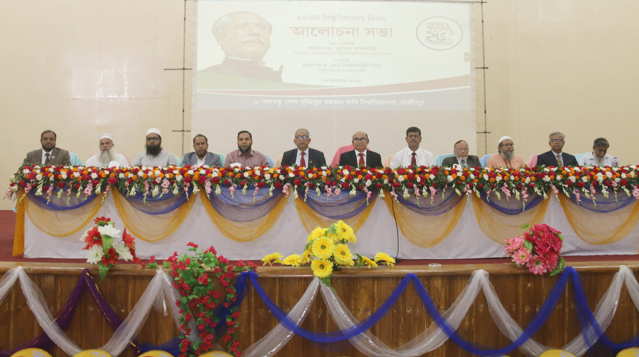 বর্ণাঢ্য আয়োজন ও উৎসবের মধ্য দিয়ে বঙ্গবন্ধু শেখ মুজিবুর রহমান কৃষি বিশ্ববিদ্যালয় (বশেমুরকৃবি) তার সাফল্য ও অর্জনের ২৬তম প্রতিষ্ঠা দিবস আজ ২২ নভেম্বর বুধবার ২০২৩ উদযাপন করছে। দিবসের শুরুতে শান্তির প্রতীক কবুতর ও রং-বেরঙের বেলুন উড়িয়ে দিবসটির শুভ সূচনা করেন প্রধান অতিথি বাংলাদেশ বিশ্ববিদ্যালয় মঞ্জুরী কমিশনের (ইউজিসি) চেয়ারম্যান, বিশ্ববিদ্যালয়ের ভাইস-চ্যান্সেলর, ট্রেজারারসহ গণ্যমান্য ব্যক্তিবর্গ। এরপরই (ইউজিসি) চেয়ারম্যান ও ভাইস-চ্যান্সেলরের নেতৃত্বে ছাত্র-ছাত্রী, শিক্ষক, কর্মকর্তা-কর্মচারী ও আমন্ত্রিত অতিথিবৃন্দের অংশগ্রহণে একটি বর্ণাঢ্য শোভাযাত্রা বিশ্ববিদ্যালয় এলাকা প্রদক্ষিণ শেষে বেগম সুফিয়া কামাল অডিটরিয়ামে এসে সমাপ্ত হয়। ভাইস-চ্যান্সেলর প্রফেসর ড. মোঃ গিয়াসউদ্দীন মিয়ার সভাপতিত্বে বিশ্ববিদ্যালয় দিবসের অনুষ্ঠানে বাংলাদেশ বিশ্ববিদ্যালয় মঞ্জুরী কমিশনের চেয়ারম্যান (ভারপ্রাপ্ত) প্রফেসর ড. মুহাম্মদ আলমগীর প্রধান অতিথি এবং বিশ্ববিদ্যালয়ের ট্রেজারার প্রফেসর তোফায়েল আহমেদ বিশেষ অতিথি হিসেবে উপস্থিত ছিলেন। বিশ্ববিদ্যালয়ের রেজিস্ট্রার মোঃ সিরাজুল ইসলাম তালুকদারের সঞ্চালনায় আলোচনা অনুষ্ঠানের শুরুতে স্বাগত বক্তব্য প্রদান করেন পরিচালক (ছাত্র কল্যাণ) প্রফেসর ড. মোঃ মাহবুবুর রহমান। শুভেচ্ছা বক্তব্য রাখেন বিশ্ববিদ্যালয় শিক্ষক সমিতির সভাপতি প্রফেসর ড. মোঃ অহিদুজ্জামান। বিশ্ববিদ্যালয়ের বিগত ২৬ বছরের সাফল্য ও অর্জনের ডকুমেন্টারি উপস্থাপনা করেন পরিচালক (গবেষণা) প্রফেসর ড. মোঃ আবিয়ার রহমান। পরে অনুষদীয় ডীনগণ অনুষদীয় পরিচিতিমূলক বক্তব্য প্রদান করেন। অনুষ্ঠানে গবেষণায় বিশেষ অবদানের স্বীকৃতি স্বরূপ পাঁচজন শিক্ষককে গবেষণা সম্মাননা ২০২৩ প্রদান করা হয়। সম্মাননা প্রাপ্তগণ হলেন: ইনস্টিটিউট অব বায়োটেকনোলজি এন্ড জেনেটিক ইঞ্জিনিয়ারিং (আইবিজিই) এর প্রফেসর ড. মোঃ তোফাজ্জল ইসলাম ও প্রফেসর ড. মোঃ মাহবুবুর রহমান, কৃষিতত্ত্ব বিভাগের প্রফেসর ড. আব্দুল্লাহ আল মামুন, ফিশারিজ ম্যানেজমেন্ট বিভাগের প্রফেসর ড. দীনেশ চন্দ্র সাহা ও গাইনিকোলজি, অবস্ট্রেটিক্স এন্ড রিপ্রোডাক্টিভ হেলথ বিভাগের প্রফেসর ড. মোঃ নাজমুল হক।