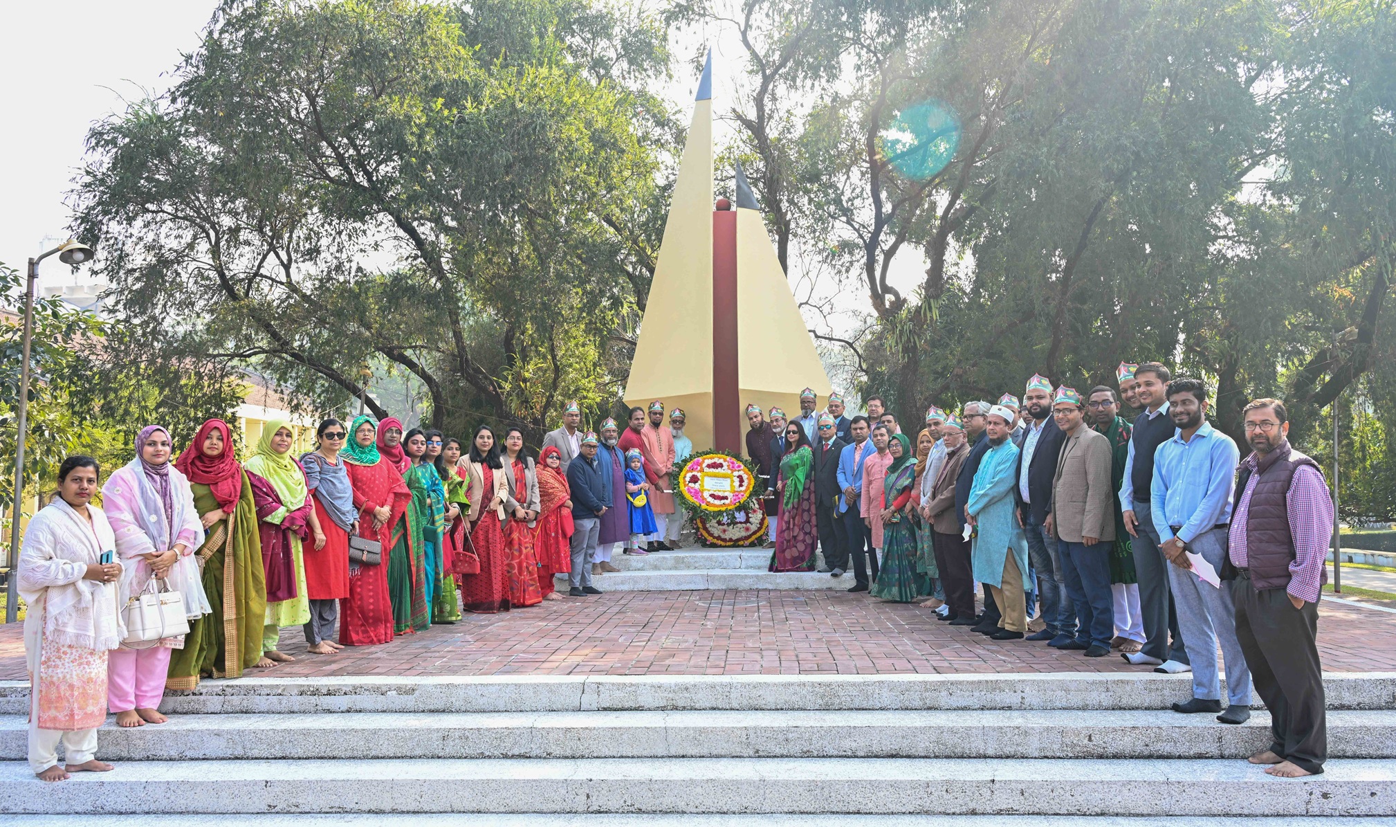 মহান মুক্তিযুদ্ধের গৌরবোজ্জ্বল ইতিহাস ও বীর শহিদদের প্রতি গভীর শ্রদ্ধা নিবেদনের মধ্য দিয়ে গাজীপুর কৃষি বিশ্ববিদ্যালয়ে (গাকৃবি) উৎসবমুখর পরিবেশে উদযাপিত হয়েছে ৫৫তম মহান বিজয় দিবস ২০২৫। দিনব্যাপী কর্মসূচির সূচনা হয় সকাল ৭টায় বিশ্ববিদ্যালয়ের ৩৬ শে জুলাই চত্বর থেকে জাতীয় পতাকা উত্তোলন ও সুশৃঙ্খল মার্চপাস্টের মাধ্যমে। এ আয়োজনে শিক্ষক, শিক্ষার্থী, কর্মকর্তা ও কর্মচারীদের সম্মিলিত অংশগ্রহণে ক্যাম্পাসজুড়ে ছড়িয়ে পড়ে দেশপ্রেম ও বিজয়ের আবেশ। সকাল ৯টা ১৫ মিনিটে গাকৃবির ভাইস-চ্যান্সেলর প্রফেসর ড. জিকেএম মোস্তাফিজুর রহমানের নেতৃত্বে বের করা হয় বর্ণাঢ্য বিজয় দিবসের আনন্দ র্যালি। র্যালি শেষে মহান মুক্তিযুদ্ধে আত্মদানকারী বীর শহিদদের প্রতি গভীর শ্রদ্ধা জানিয়ে বিশ্ববিদ্যালয়ের কেন্দ্রীয় শহিদ মিনারে পুষ্পস্তবক অর্পণ করেন উপাচার্য। পরে পৃথক পৃথকভাবে পুষ্পস্তবক অর্পণ করেন শিক্ষক সমিতি, বিশ্ববিদ্যালয়ের প্রাইমারি ও হাইস্কুলের শিক্ষক-শিক্ষার্থীবৃন্দ, বিভিন্ন হলের প্রভোস্ট ও শিক্ষার্থীবৃন্দ, কর্মকতা, কর্মচারী ও শ্রমিকবৃন্দ। পরবর্তীতে সকাল ৯টা ৩০ মিনিট থেকে বিশ্ববিদ্যালয়ের শিক্ষক, কর্মকর্তা ও কর্মচারীবৃন্দের সন্তানদের জন্য আয়োজন করা হয় চিত্রাঙ্কন প্রতিযোগিতা। এতে শিশুকিশোরদের রং তুলির আঁচড়ে ফুটে ওঠে মুক্তিযুদ্ধ ও বিজয়ের চেতনা। একই সময়ে বিশ্ববিদ্যালয়ের ছাত্র ও ছাত্রী, শিক্ষক, কর্মকর্তা, কর্মচারী ও শ্রমিকগণের জন্য শহীদ তাজউদ্দীন আহমদ হল সংলগ্ন মাঠে বিভিন্ন ইভেন্টে প্রীতি খেলাধুলার আয়োজন করা হয়। খেলাধুলা শেষে মহান বিজয় দিবসের তাৎপর্য তুলে ধরে একটি সংক্ষিপ্ত আলোচনাসভা অনুষ্ঠিত হয়। আলোচনা সভায় প্রধান অতিথি হিসেবে উপস্থিত ছিলেন বিশ্ববিদ্যালয়ের ভাইস-চ্যান্সেলর প্রফেসর ড. জিকেএম মোস্তাফিজুর রহমান। বিশেষ অতিথি হিসেবে উপস্থিত ছিলেন প্রো-ভাইস-চ্যান্সেলর প্রফেসর ড. এম. ময়নুল হক এবং ট্রেজারার প্রফেসর ড. মোঃ সফিউল ইসলাম আফ্রাদ। এছাড়াও উপস্থিত ছিলেন ডিন, পরিচালক, শিক্ষক সমিতির সভাপতি ও সেক্রেটারি, বিশ্ববিদ্যালয়ের রেজিস্ট্রার, প্রক্টরসহ শিক্ষক-শিক্ষার্থী, কর্মকর্তা-কর্মচারী ও শ্রমিকবৃন্দ। দিবসের তাৎপর্য তুলে ধরে উপস্থিত অতিথিবৃন্দ বক্তব্য প্রদান করেন। এ সময় প্রধান অতিথির বক্তব্যে ভাইস-চ্যান্সেলর বলেন, “মহান বিজয় দিবস আমাদের জাতীয় জীবনের সর্বোচ্চ গৌরব ও অহংকারের প্রতীক। ১৯৭১ সালে লাখো সূর্য সন্তান শহিদের আত্মত্যাগের বিনিময়ে অর্জিত স্বাধীনতা আমাদের শুধু একটি ভূখÐ নয়, দিয়েছে আত্মপরিচয়, মর্যাদা ও আত্মবিশ্বাস। এদিক থেকে ১৬ই ডিসেম্বরের মহান বিজয় এবং ২৪’র গণঅভ্যুত্থানের ৫ই আগস্টের বিজয় য