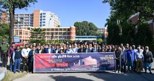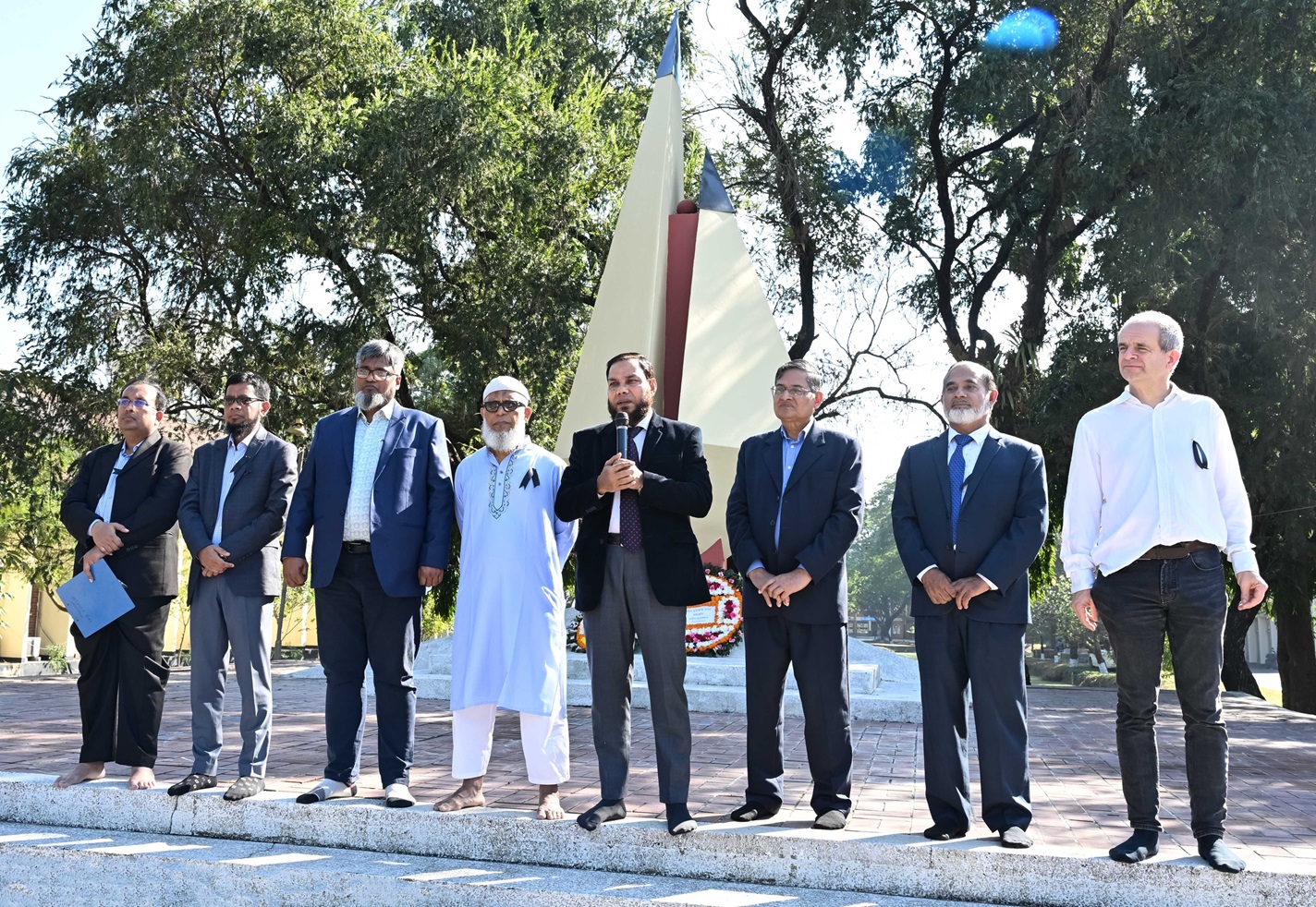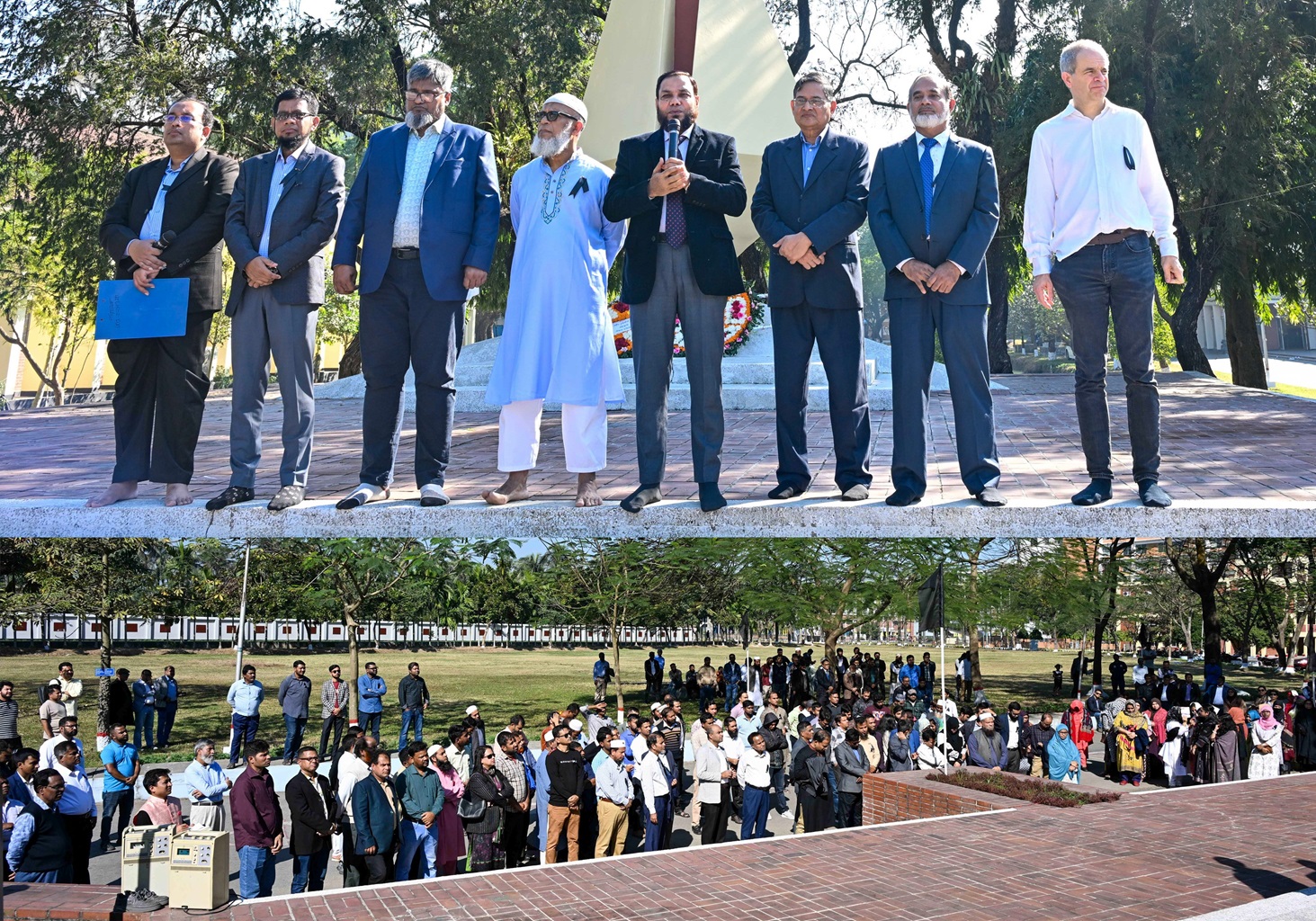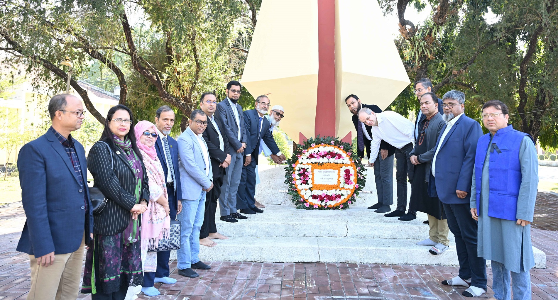 Gazipur Agricultural University (GAU) observed Martyred Intellectuals Day 2025 with profound respect, solemnity, and heartfelt remembrance, honoring the nation’s finest sons who were brutally martyred on 14 December 1971 during the final phase of the Great War of Liberation. The day-long observance began with the national flag being flown at half-mast across the university campus. A black flag was also hoisted at the 36th July Chattar as a symbolic expression of national grief and sorrow. At 9:30 a.m., faculty members, officers, staff and students wore black badges and paid collective tribute to the martyred intellectuals. Under the leadership of Vice-Chancellor Professor Dr. GKM Mustafizur Rahman, a silent mourning rally was held with the participation of deans, directors, teachers, students, officers and employees. The rally peacefully marched around the campus and concluded at the Central Shaheed Minar, where the Vice-Chancellor paid floral tributes on behalf of the university. Subsequently, the Teachers’ Association and other faculty members also placed wreaths in remembrance. Following the tribute ceremony, a brief meaningful discussion session was held at the Shaheed Minar, moderated by Professor Dr. Mohammad Sharif Raihan, Director (Student Welfare). The session was addressed by the Vice-Chancellor, Pro-Vice-Chancellor Professor Dr. M. Moynul Haque, Treasurer Professor Dr. Md. Safiul Islam Afrad, President of the Teachers’ Association Professor Dr. Md. Abu Ashraf Khan, General Secretary Professor Dr. Md. Moshiul Islam, Registrar Md. Abdullah Mridha and Assistant Registrar (Law and State) Abu Hanif Palowan. The speakers emphasized that the sacrifice of the martyred intellectuals remains an unparalleled chapter in national history and continues to inspire future generations with the values of patriotism, humanity and moral courage. They urged everyone to remain vigilant so that the spirit of this sacrifice is never undermined. In his address, the Vice-Chancellor noted that, “the systematic killing of intellectuals was aimed at crippling the nation intellectually and stressed the need for unity beyond political differences to safeguard the country and uphold the ideals of independence. Even Because of local collaborators and traitors, the great proclaimer of independence, martyred President Ziaur Rahman, had to sacrifice his life for the country.” As part of the observance, a special prayer was offered after Zuhr at the university’s central mosque, seeking forgiveness and eternal peace for the souls of the martyred intellectuals.