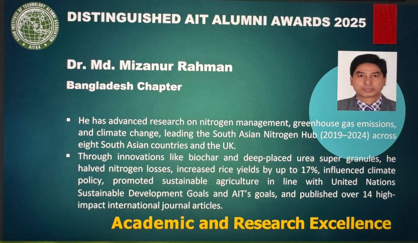 Recently, Prof. Rahman has been awarded Distinguished AIT Alumni Award 2025 (Category: Academic and Research Excellence) of the Asian Institute of Technology (AIT), Bangkok.
